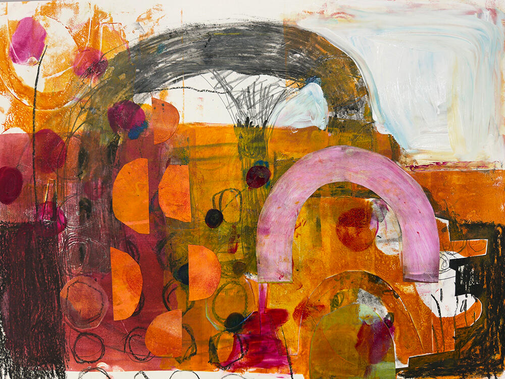 I was raised in the Maryland suburbs – an environment that was neither country nor city, but the land between. I carry this sense of in-betweenness into my studio, along with my brushes and paints.My artwork reveals my attraction to edges, the spaces between, and the ways we bridge those divides. I am drawn to intersections, particularly between manmade and natural realms. I prefer a park to the wild, because I enjoy how humanity and nature can inform and shape one another. That conversation frames my work, whether representational or abstract.When edges collide or we enter that space between, there is an opportunity for something new and unexpected. I revel in that sense of surprise, and I invite viewers to experience their own delight and wonder in those spaces and intersections.My favorite current work often begins with a monoprint and includes cut-paper collage and drawing. You will often see arch shapes that might hint at vessels, portals, or bridges. I love how this use of layers can create and resolve complexity.My still and animated works are accessible and reflective of my humor, sense of play, and ready wonderment. The process of creating is life-giving to me.