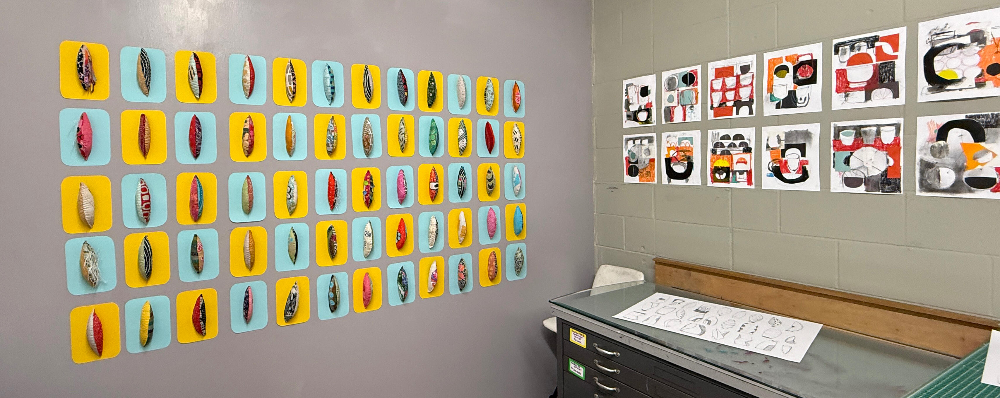 I was raised in the Maryland suburbs – an environment that was neither country nor city, but the land between. I carry this sense of in-betweenness into my studio, along with my brushes and paints.My artwork reveals my attraction to edges, the spaces between, and the ways we bridge those divides. I am drawn to intersections, particularly between manmade and natural realms. I prefer a park to the wild, because I enjoy how humanity and nature can inform and shape one another. That conversation frames my work, whether representational or abstract.When edges collide or we enter that space between, there is an opportunity for something new and unexpected. I revel in that sense of surprise, and I invite viewers to experience their own delight and wonder in those spaces and intersections.My favorite current work often begins with a monoprint and includes cut-paper collage and drawing. You will often see arch shapes that might hint at vessels, portals, or bridges. I love how this use of layers can create and resolve complexity.My still and animated works are accessible and reflective of my humor, sense of play, and ready wonderment. The process of creating is life-giving to me.